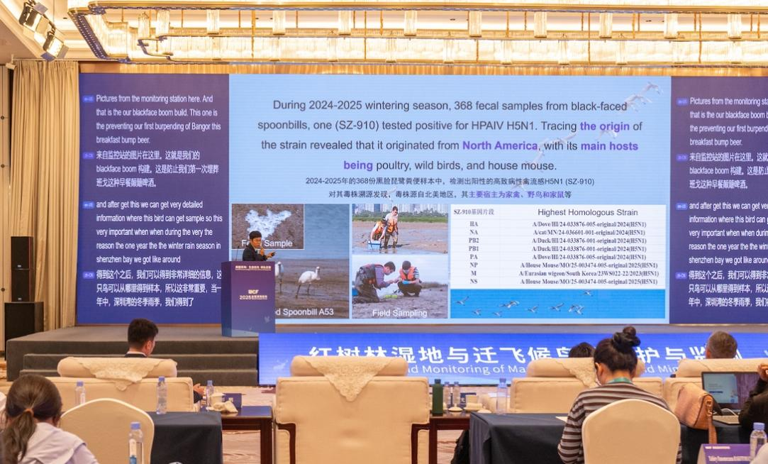 深圳大学研究员、中国湿地保护协会理事周海超介绍了红树林的生态功能及其对迁飞通道的支撑,展示了深圳湾在东亚—澳大利西亚迁飞通道上的监测发现与案例,结合卫星追踪与监测解析黑脸琵鹭等物种的迁徙规律与禽流感病原风险,并建议强化停歇地保护、完善生态廊道、推进跨部门数据共享与公众科普,拓展与IMC的跨区域联动监测与防控。
