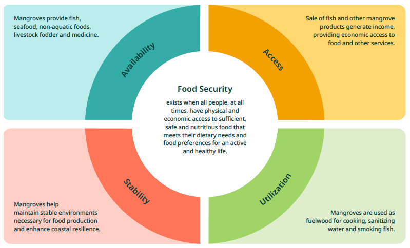 红树林在基于生态系统的适应、碳汇和碳储存以及生物多样性保护方面具有不可替代的重要作用。它们保护海岸线,减少污染,并缓冲日益加剧的风暴、飓风和海平面上升等极端气候影响。与包括海草床在内的其他海岸景观共同作用,红树林在实现多个可持续发展目标方面发挥着关键作用,例如关于水、气候行动、水下生物和陆地生物的目标(SDGs6.6.1,13、14和15)。正如《2024年世界红树林状况》(2024年,全球红树林联盟,第5.1章)中强调的,红树林的高生产力维持了丰富的食物网,关联着粮食安全的四个重要维度(见图1)。